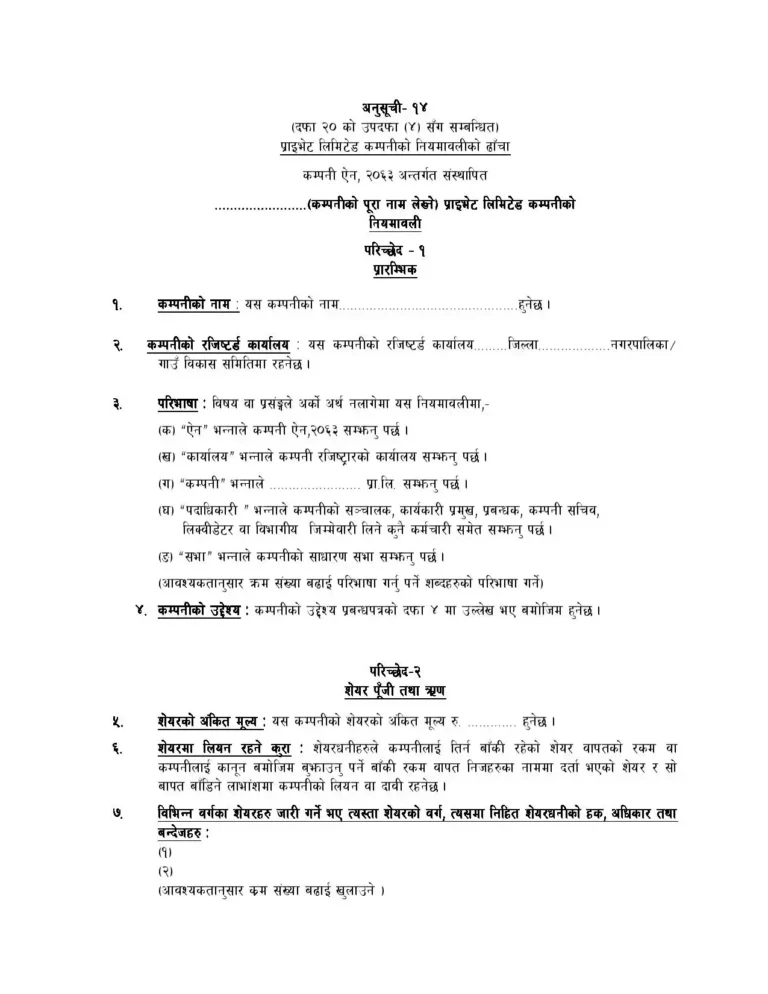 Sample Format of Articles of Association (Aoa) in the Nepali Language